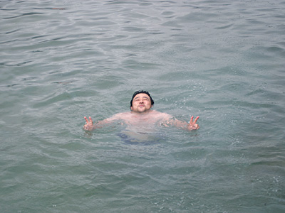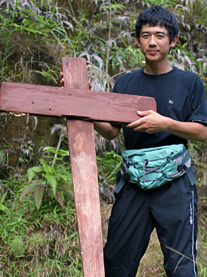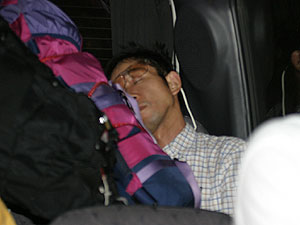 荷物に埋もれて爆睡する井上さん(即身仏1号)